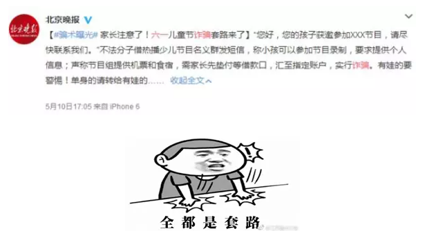 “您好,您的孩子获邀参加XXX节目,请尽快联系我们。”不法分子借热播少儿节目名义群发短信,称小孩可以参加节目录制,要求提供个人信息;声称节目组提供机票和食宿,需家长先垫付等借款口,汇至指定账户,实行诈骗。有娃的要警惕!单身的请转给有娃的……